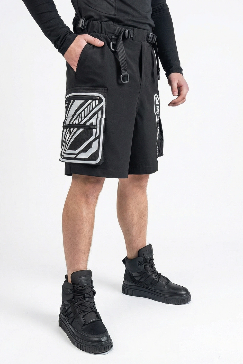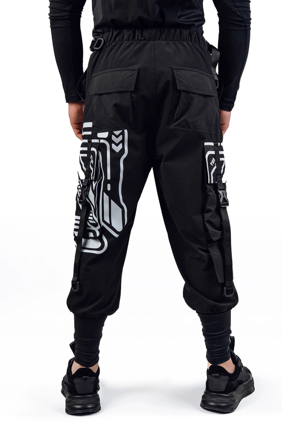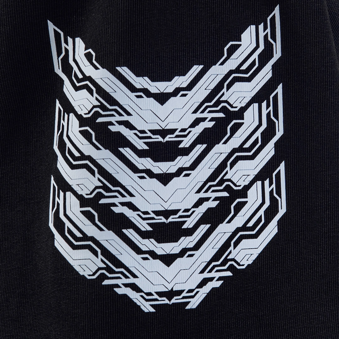 Модель виконана зі стрейч куліру — трикотажної тканини середньої щільності з гладкою поверхнею та м’якою текстурою. Матеріал має матовий фініш і забезпечує комфорт при контакті зі шкірою. Завдяки вмісту поліестеру полотно краще зберігає форму, менше піддається деформації та витримує регулярне використання. Тканина еластична, добре адаптується до рухів і не обмежує мобільність. Горловина оброблена рібаною, що забезпечує стабільність форми та щільне прилягання без розтягування. Декоративні елементи виконані у вигляді принтів і вишивки в стилі кіберпанк та футуризму, що додає виробу візуальної глибини та графічності.