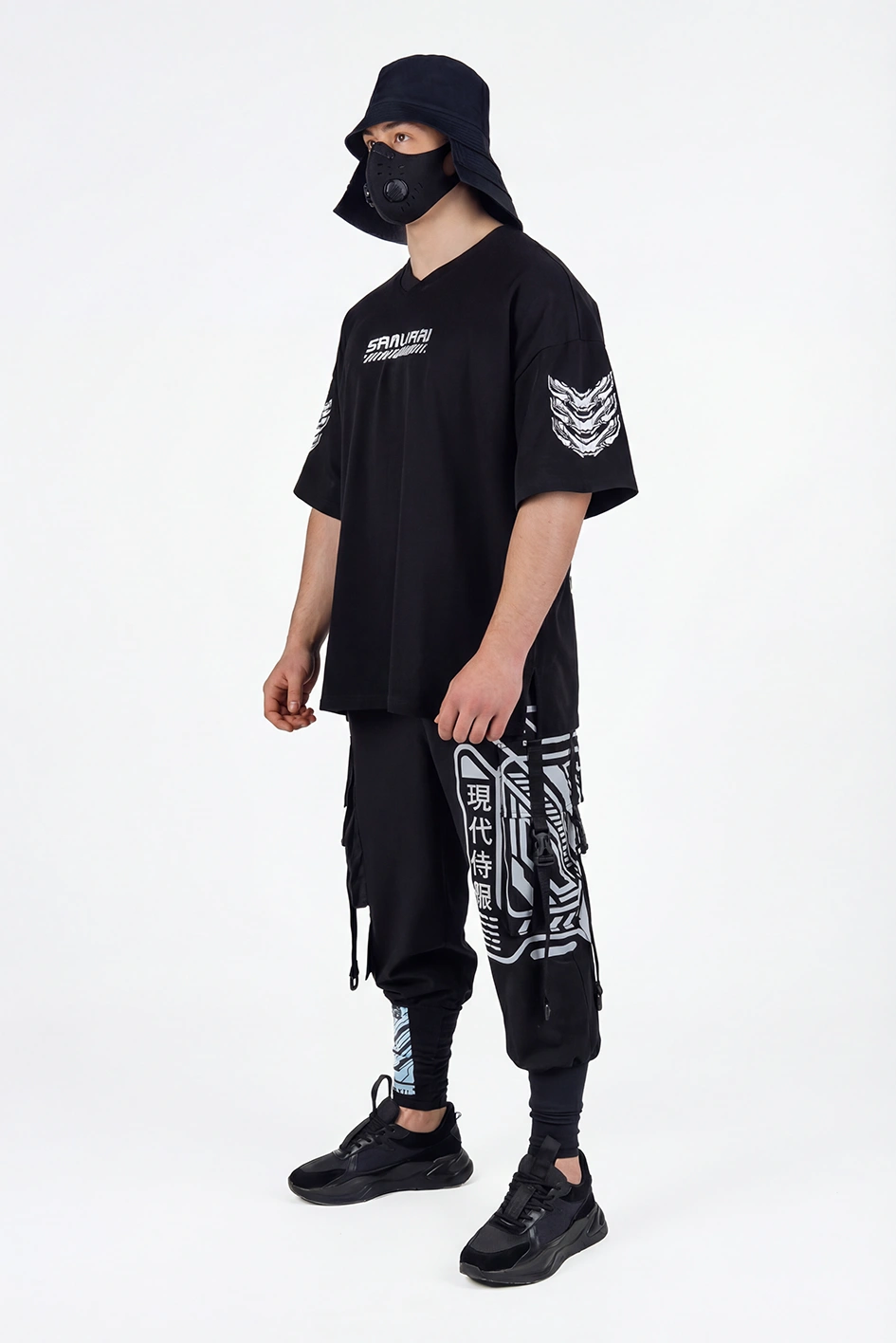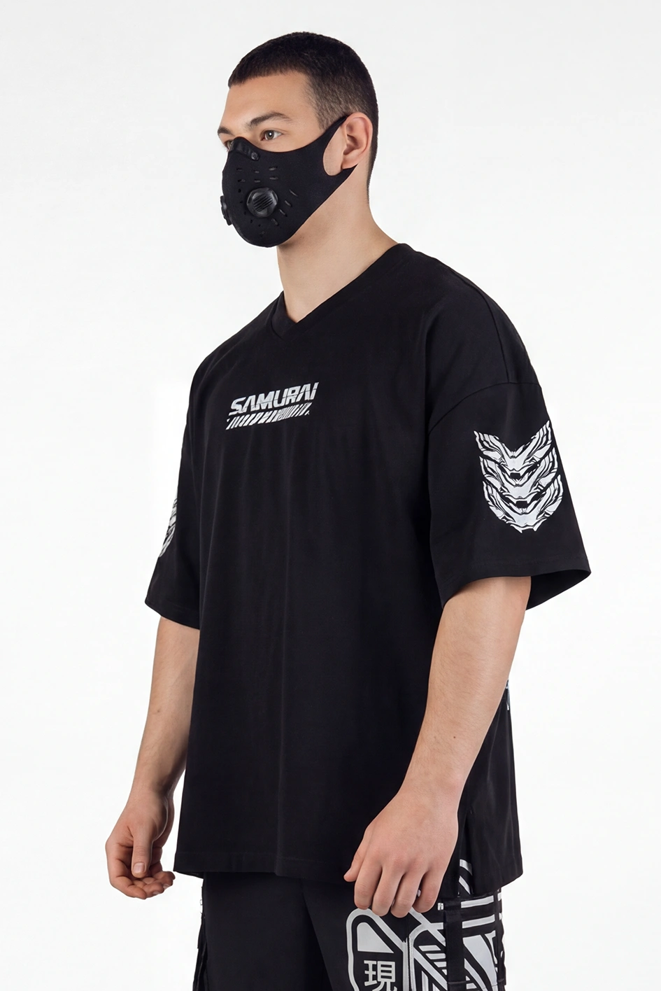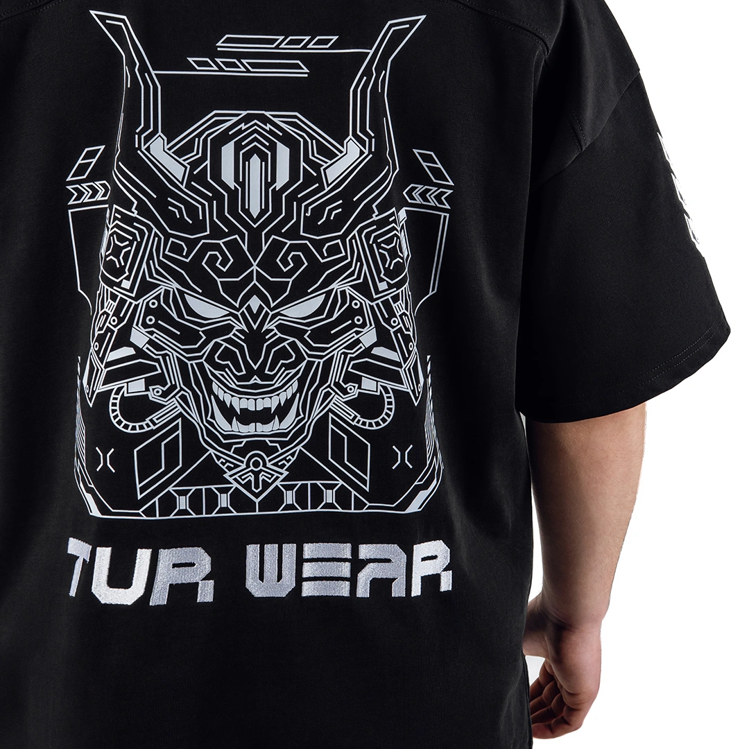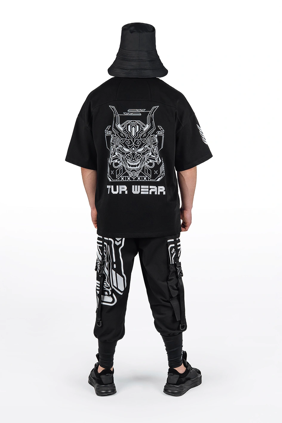 Футболка оверсайз крою з подовженим силуетом та асиметрією по довжині. Назва моделі Arasaka натхненна однойменною корпорацією з всесвіту Cyberpunk 2077, що відображено у стилістиці дизайну. Горловина виконана у формі кімоно, що формує характерну геометрію верхньої частини виробу. На спинці передбачений додатковий рельєф, який підсилює конструкцію та додає об’єму. Збоку розташований розріз для зручності руху та кращої посадки. Модель доповнена графічними принтами та вишивкою, що підкреслюють кіберпанк естетику. Футболка інтегрується у стилізації cyberpunk, urban samurai та повсякденний міський гардероб.