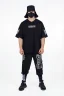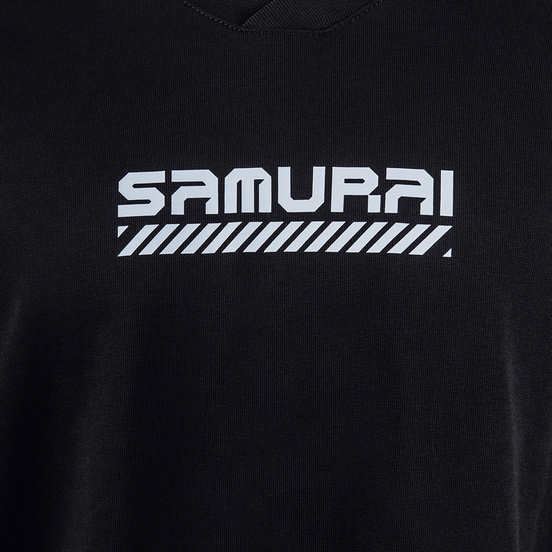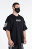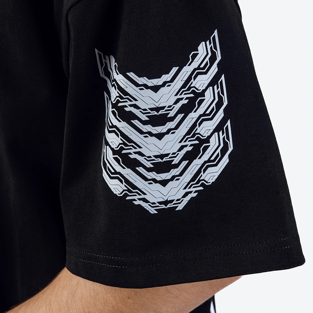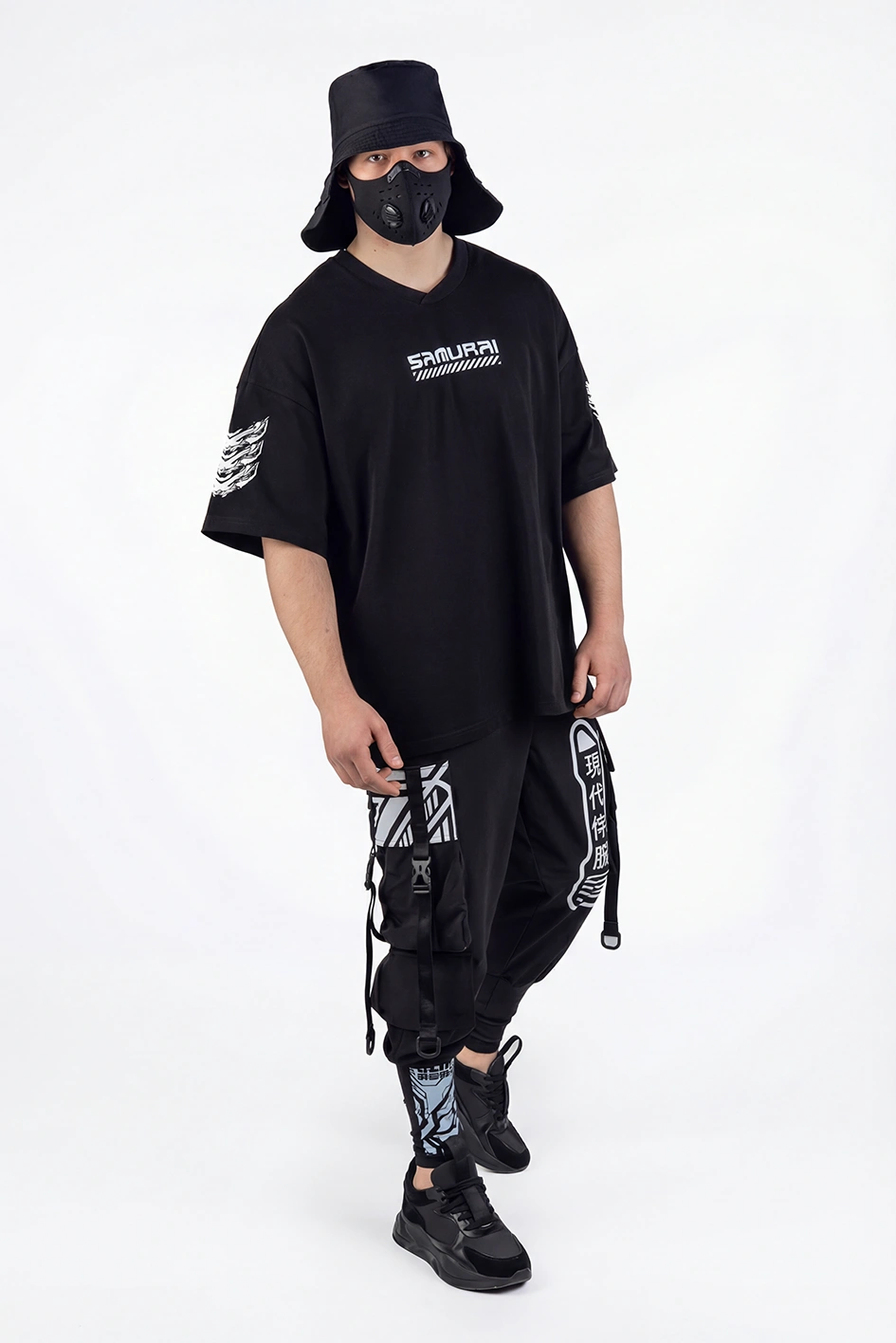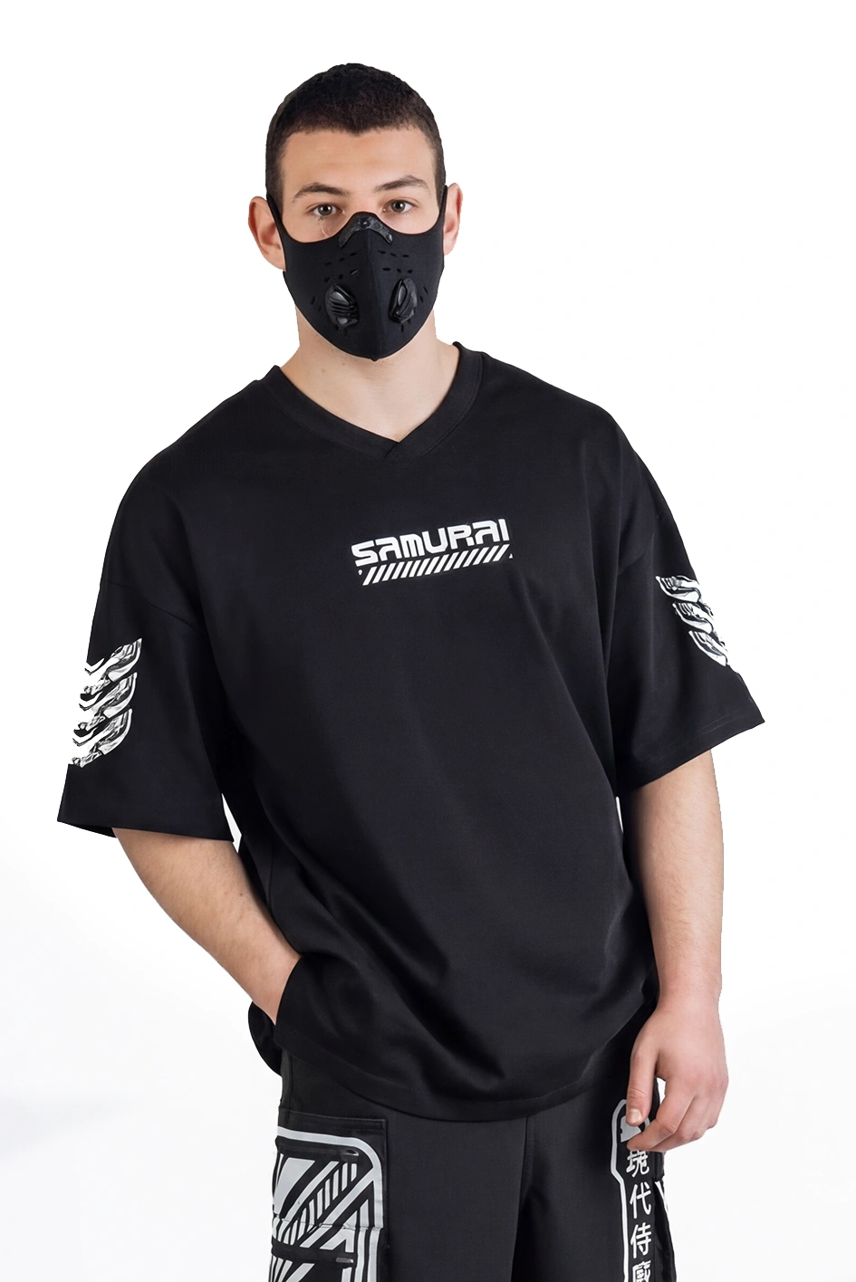 Футболка оверсайз крою з подовженим силуетом та асиметрією по довжині. Назва моделі Arasaka натхненна однойменною корпорацією з всесвіту Cyberpunk 2077, що відображено у стилістиці дизайну. Горловина виконана у формі кімоно, що формує характерну геометрію верхньої частини виробу. На спинці передбачений додатковий рельєф, який підсилює конструкцію та додає об’єму. Збоку розташований розріз для зручності руху та кращої посадки. Модель доповнена графічними принтами та вишивкою, що підкреслюють кіберпанк естетику. Футболка інтегрується у стилізації cyberpunk, urban samurai та повсякденний міський гардероб.