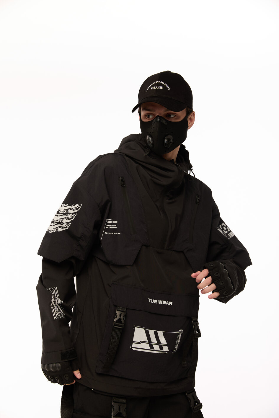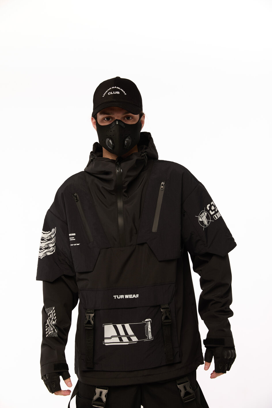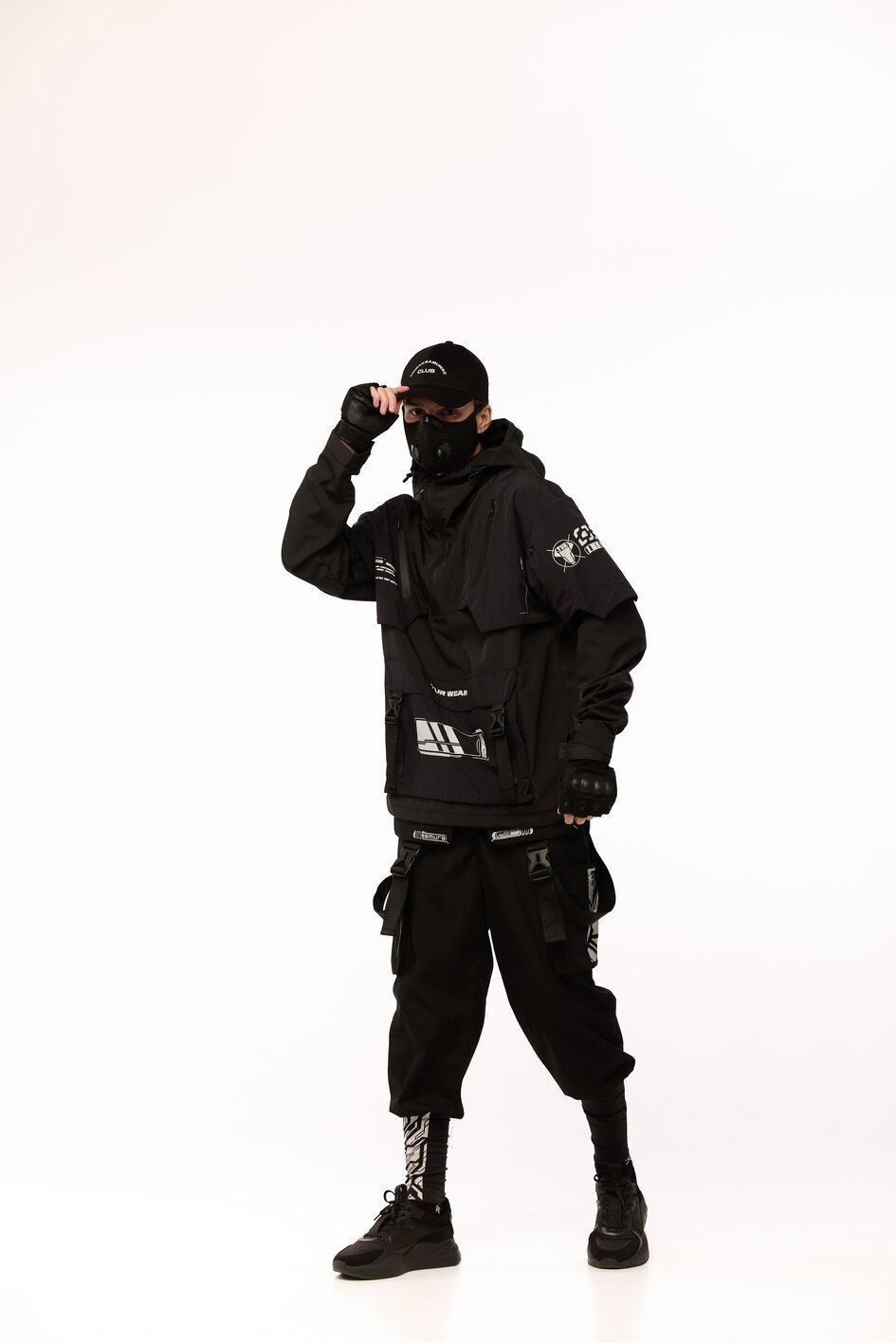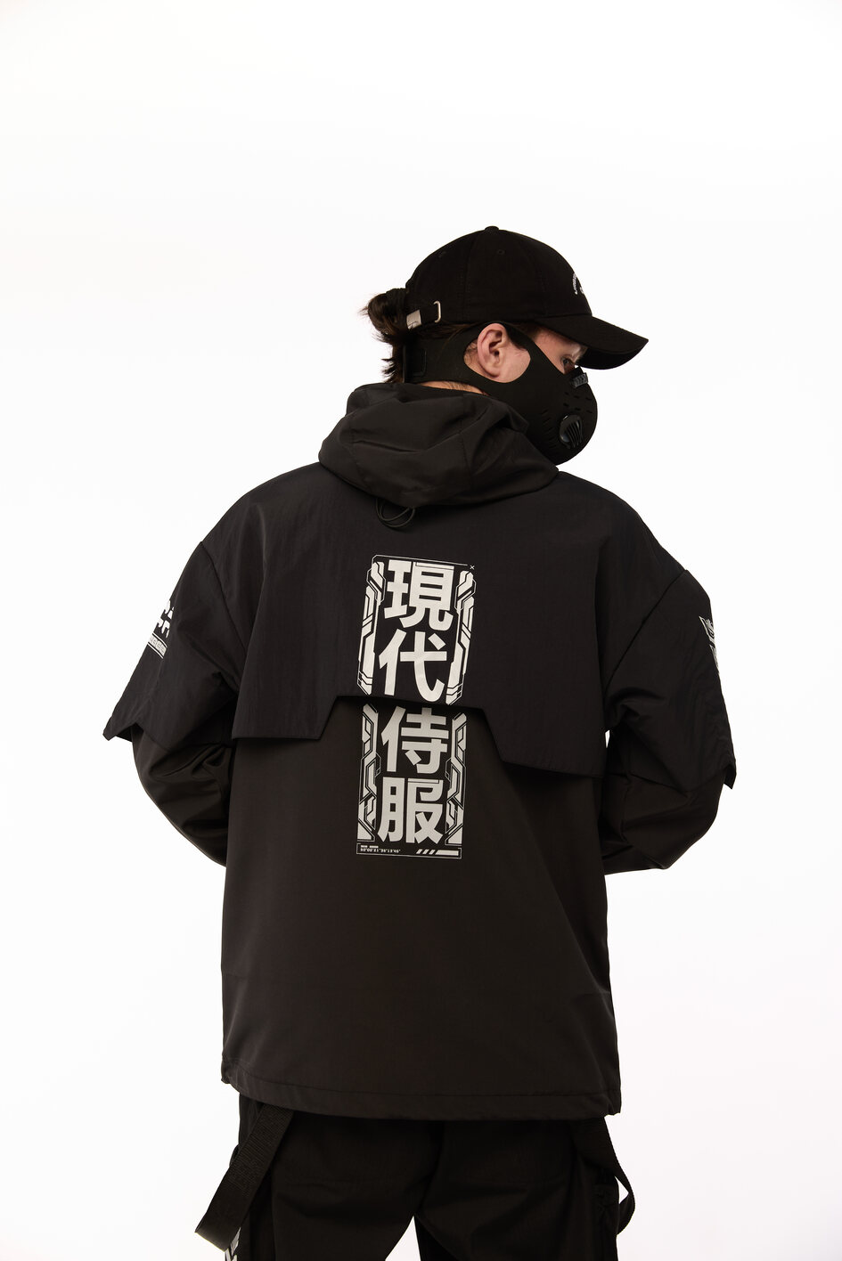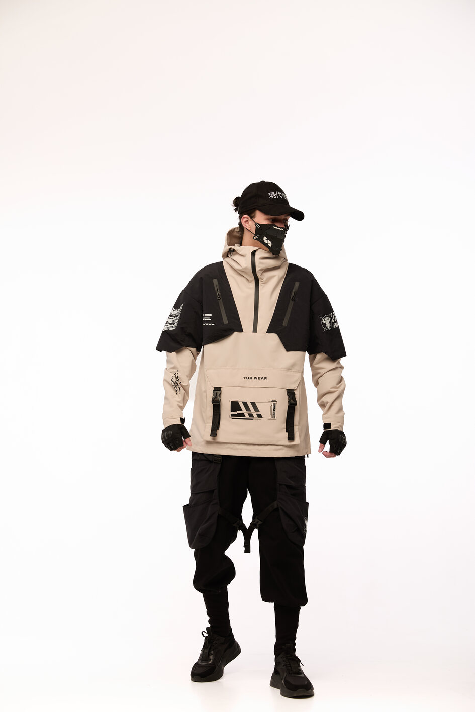 Сет SOUL OF DARK 2 — це бойова естетика для тих, хто звик тримати власну лінію в хаосі міста. Анорак із гострою геометрією принтів, карго штани зі зйомними сумками, кросівки з замшевими вставками і кепка з японськими ієрогліфами — кожен елемент несе не просто функцію, а меседж. Це лук для самурая майбутнього, який знає: стиль — це теж зброя.