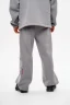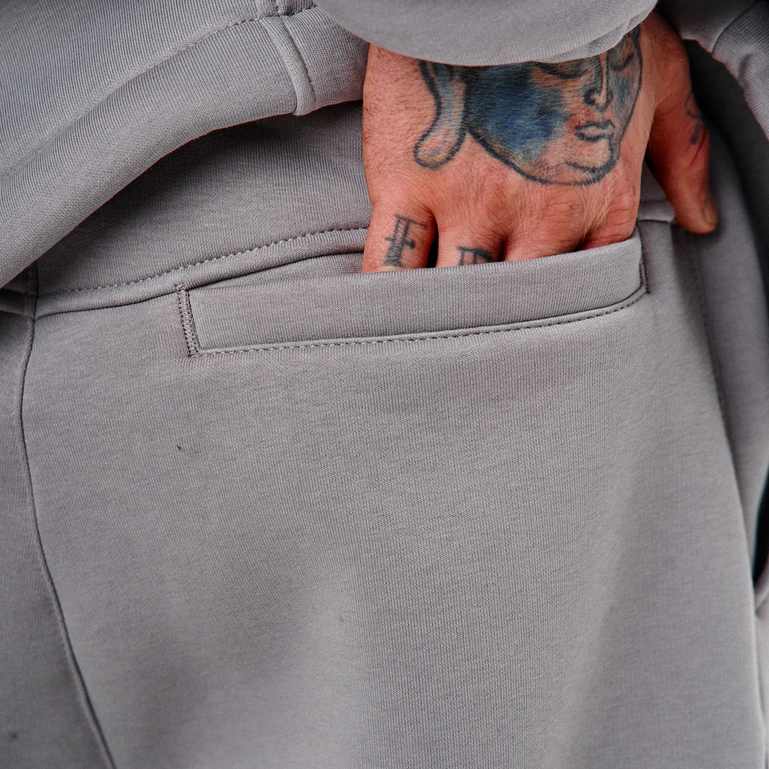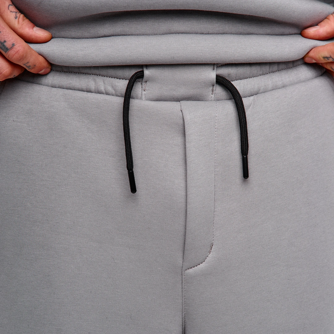 Штани прямого крою, виготовлені з бавовняного трикотажу тринитка діагональ щільністю 450 г/м². Завдяки високій щільності матеріалу, модель є демісезонною — за тепловими властивостями не поступається флісовим тканинам (для порівняння: стандартна тринитка на флісі має щільність 280 г/м²).