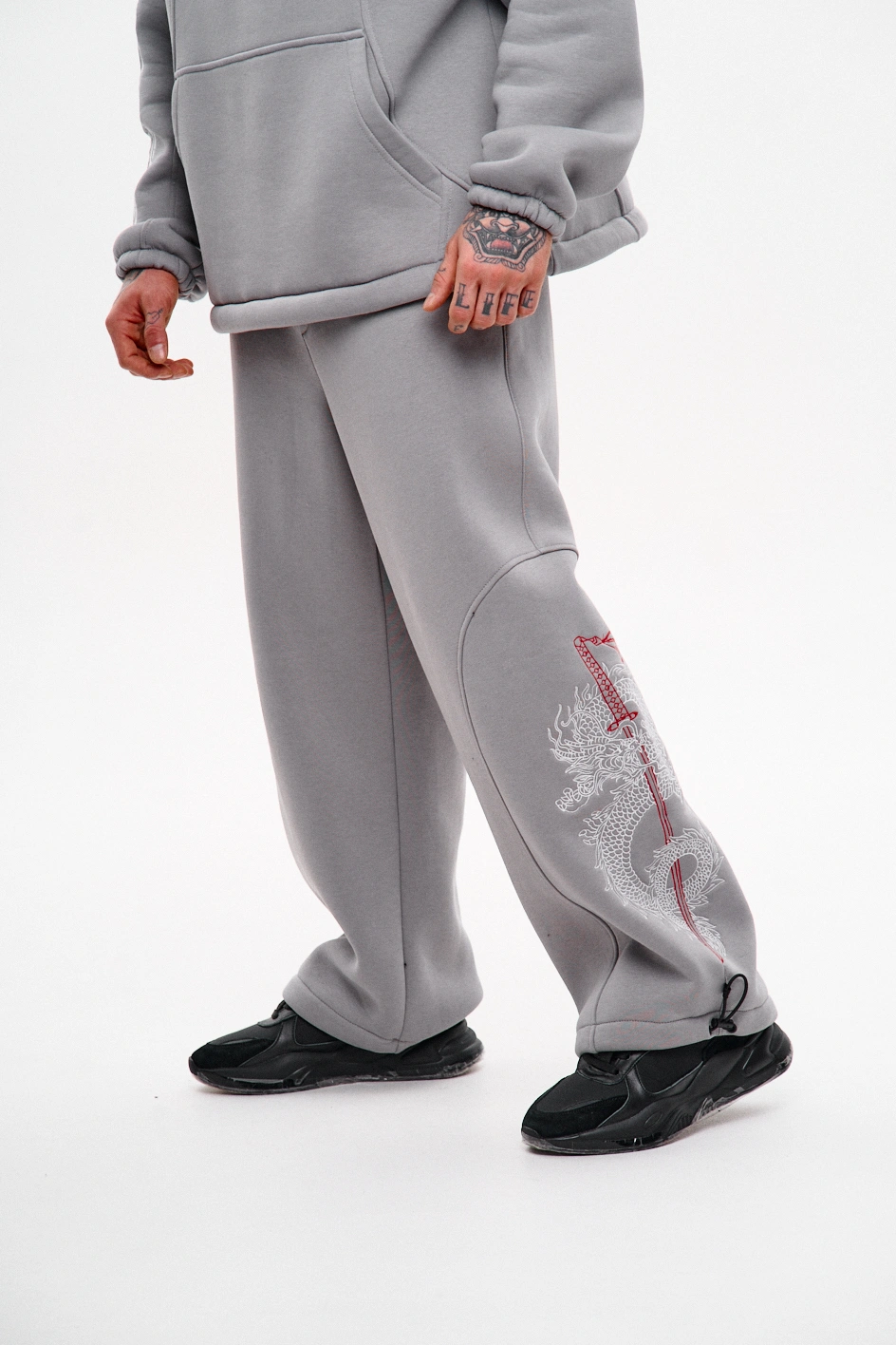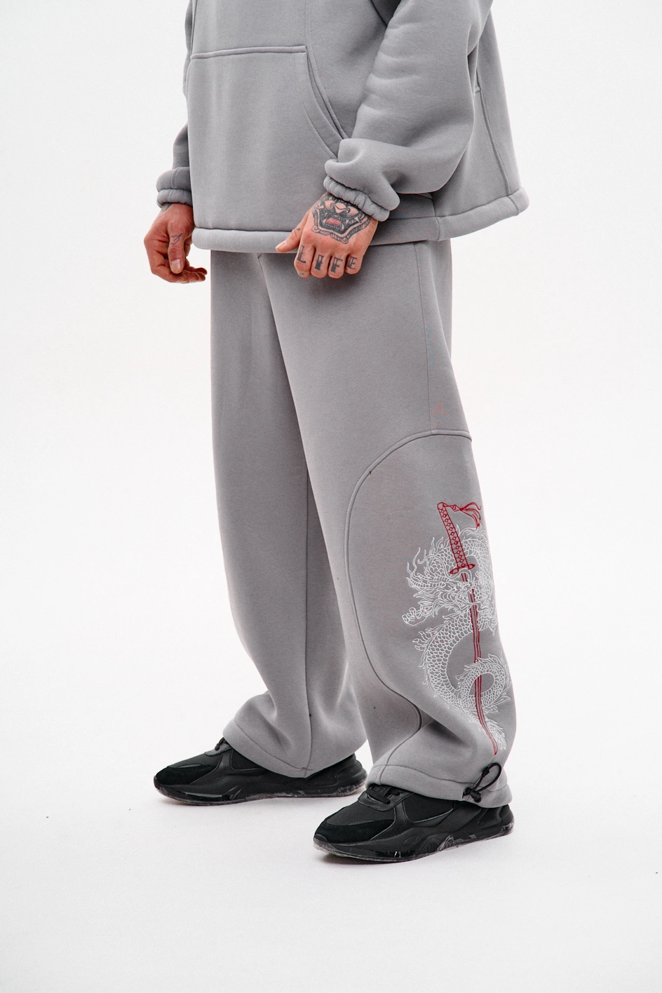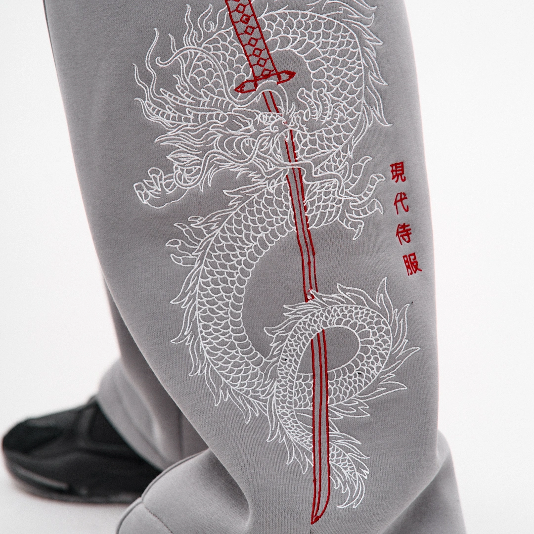 У нижній частині — регулювання на шнур-резинці для адаптації під взуття. Мають дві верхні та дві задні кишені. На лівій штанині — фігурна декоративна деталь з вишивкою в японському стилі. Назва моделі “Рюу” — не випадкова: з японської перекладається як дракон і відсилає до символіки з художньої виставки, на якій базується концепція. Ідеально поєднуються з худі "Рюу", утворюючи повноцінний костюм у фірмовій естетиці.Машинне прання при максимальній температурі 30 ºC із коротким циклом віджимання.